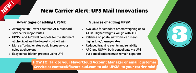 IMPORTANT: UPSMI relies on postal carriers like USPS (United States Postal Service), so be advised that they can have a higher rate of package loss, package damage, and reduced tracking in exchange for those lower costs. UPSMI consolidates via UPS, just like APC does today. You can also use your existing UPSMI pick-up if you have one already for domestic shipping (a different pick-up from UPS). Talk to your FlavorCloud Account Manager or email our Customer Service team to enable UPSMI for you today!