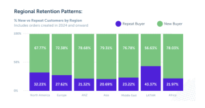 Consumer behavior within each market also reflects the broader logistics climate. Australia and New Zealand boast conversion rates near 20%, while Latin America struggles at 5% due to high duties and complex import rules. The Middle East leads globally in AOV at $160.86, highlighting opportunities for premium positioning. Retention remains strongest in Latin America (43%) and North America (32%), while newer markets like Singapore and New Zealand require stronger post-purchase engagement and clearer returns experiences.